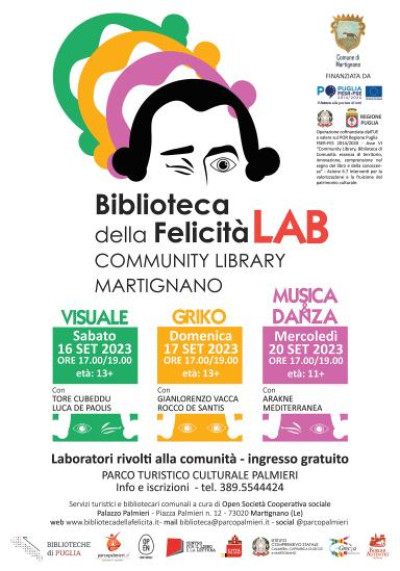 La Cooperativa sociale Open di Parco Palmieri, ente gestore dei servizi bibliotecari comunali, nell’ambito delle attività di animazione culturale del progetto “Biblioteca della Felicità” COMMUNITY LIBRARY del Comune di Martignano, presenta tre laboratori formativi ed esperienziali di approfondimento sul linguaggio visuale, sulla lingua e cultura grika, sulle tradizioni musicali del territorio.